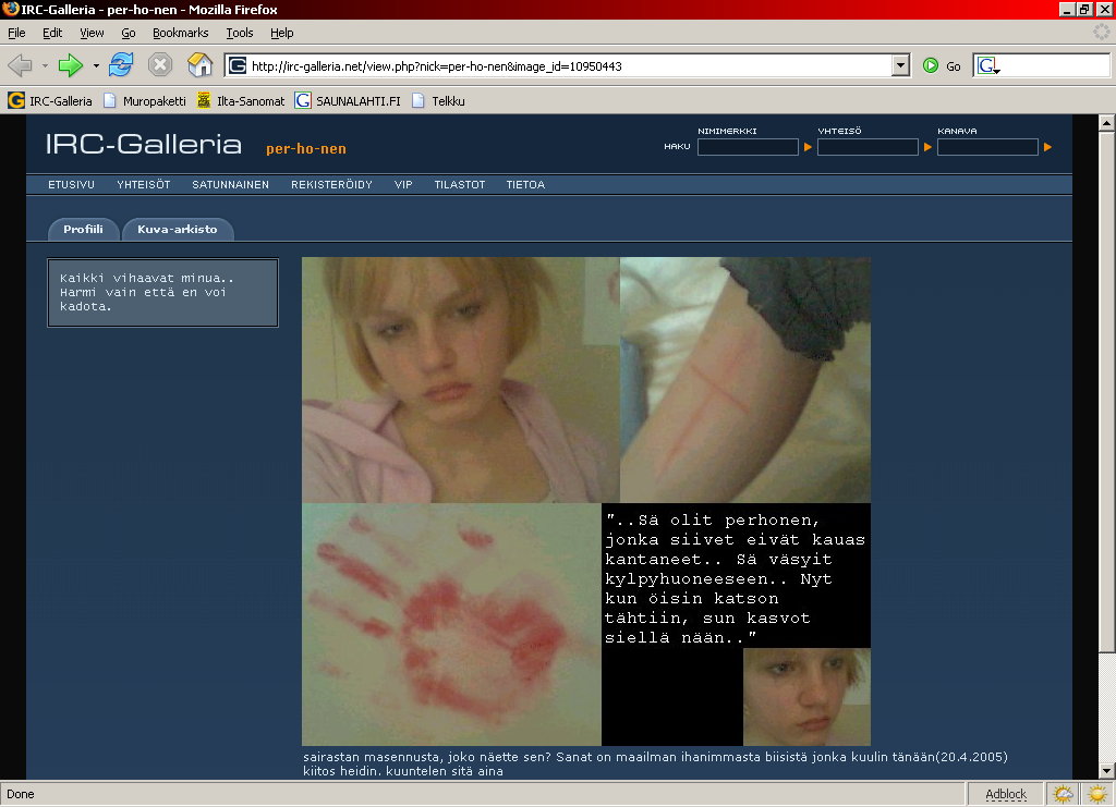 3/16/2005 10:53 Live_Wire http://www.kaleva.fi/html/JTpage470550.html 3/16/2005 10:54 silent- http://www.thottbot.com/?q=938 3/16/2005 10:54 Live_Wire http://www.kaleva.fi/html/JTpage470553.html 3/16/2005 11:05 silent- http://www.thottbot.com/index.cgi?i=6898 3/16/2005 11:17 desaster http://www.thottbot.com/index.cgi?i=3567 3/16/2005 11:18 Live_Wire http://dunkku.net/munat.jpg 3/16/2005 11:20 fibi http://www.thottbot.com/index.cgi?i=20324 3/16/2005 11:25 T^Eagle http://lib.hut.fi/ 3/16/2005 11:29 walerock http://www.worth1000.com/cache/gallery/contestcache.asp?contest_id=2233 3/16/2005 11:32 sampi http://www.otalib.fi/tkk/index.html 3/16/2005 11:41 Grendel-B http://www.warofenlightenment.com 3/16/2005 11:47 Scorpio^f http://forums-en.wow-europe.com/thread.aspx?fn=wow-general-en&t=63765&p=1&tmp=1#post63765 3/16/2005 11:53 walerock http://alt.tnt.tv/games/thedoors/ 3/16/2005 11:54 th http://www.funpic.hu/files/pics/00017/00017900.jpg 3/16/2005 11:56 toumasho http://www.thoriumpower.com/english/about/history.htm 3/16/2005 11:57 EPPiN www.rajalacamera.fi 3/16/2005 11:57 Galwran www.khaaan.com 3/16/2005 12:27 dahakon http://shop.blizzard.com/section5 3/16/2005 12:31 _gene http://www.perverts.nl/files/gbmxxx-pub2.avi 3/16/2005 12:36 vvk_ http://www.gamespy.com/articles/595/595975p1.html 3/16/2005 12:37 mann http://irc-galleria.net/view.php?nick=Tigerlily&image_id=5202819 3/16/2005 12:40 Daliden www.wow-europe.com 3/16/2005 12:40 inaj http://www.wow-europe.com/en/patchnotes/patch-07-03-2005.html 3/16/2005 12:54 Juuba http://www.thottbot.com/?q=3008 3/16/2005 12:55 _Juha_ http://www.theangrydwarf.com/Grudges.wmv 3/16/2005 12:56 Ovela http://objective.jesussave.us/kidz.html 3/16/2005 12:58 Whist http://www.wow-europe.com/en/info/basics/resting.html 3/16/2005 12:58 Oko www.calibrant.fi/otto/solution.jpg 3/16/2005 13:18 sannako http://www.cars.auto.ru/sale/SF59881/448506/ 3/16/2005 13:45 Elfrey http://jpoptrash.nihon-fr.com/chanteurs/gackt1.jpg 3/16/2005 13:46 Scorpio^f http://www.sosiaalisestirajoittuneet.fi/index.php?date=20050307 3/16/2005 13:46 Opsi http://www.deviantart.com/view/14864502 3/16/2005 13:46 telescope http://deathball.net/notpron/notpron.htm 3/16/2005 13:46 James` http://www.helsinginsanomat.fi/teksti/tuoreet/artikkeli/1101978846513 3/16/2005 13:54 Live_Wire http://homepage.mac.com/deadtroll2/.Movies/helldeskcable.wmv 3/16/2005 13:57 Jermi http://irc-galleria.net/view.php?nick=Clover-&image_id=3843324 3/16/2005 14:01 vvk_ http://personal.inet.fi/koti/kuosa/sh3.html 3/16/2005 14:03 Antsa http://www.helsinginsanomat.fi/tuoreet/artikkeli/1101978846513 3/16/2005 14:05 Harma http://www.helsinginsanomat.fi/tuoreet/artikkeli/1101978839059 3/16/2005 14:09 itn http://www.subsim.com/ssr/sh3_rc1/sh3_review.htm 3/16/2005 14:13 vvk_ http://sinuhe.jypoly.fi/~c6732/Morning_Musume_-_Watching_The_Ring.mpg 3/16/2005 14:25 globe http://www.helsinginsanomat.fi/tuoreet/artikkeli/1101978846513 3/16/2005 14:38 Juuba http://deathball.net/notpron/ 3/16/2005 14:45 Mangrove http://www.simviation.com/cgi-bin/yabb/YaBB.cgi?board=homebuild;action=display;num=1110932078;start=0 3/16/2005 14:49 Daliden http://www.bash.org/?24 3/16/2005 14:52 alphamale http://www.ageofconsent.com/ageofconsent.htm 3/16/2005 14:56 Scorpio^f http://www.bash.org/?469064 3/16/2005 14:59 Daliden http://themaxx.com/offensive/pages/pic.php?id=43597 3/16/2005 15:11 juh0 http://www.d20srd.org/extras/mapProjection.htm 3/16/2005 15:24 inaj http://www.samsung.com/fi/products/monitors/tft19/913n.asp 3/16/2005 15:33 xfactor http://themaxx.com/offensive/pages/pic.php?id=43544 3/16/2005 15:33 _Jari_ http://img171.exs.cx/my.php?loc=img171&image=screenshot0313051639311hg.jpg 3/16/2005 15:37 Scorpio^f http://www.bash.org/?464561 3/16/2005 15:58 Mangrove http://www.airliners.net/open.file/418378/L/ 3/16/2005 16:05 Fishu http://www.helsinginsanomat.fi/tuoreet/artikkeli/1101978848624 3/16/2005 16:05 Hunttis http://forums-en.wow-europe.com/thread.aspx?FN=wow-general-en&T=64341 3/16/2005 16:05 jakee http://forums-en.wow-europe.com/thread.aspx?ForumName=wow-suggestion-en&ThreadID=8573 3/16/2005 16:26 Monni^ http://sisu.typepad.com/sisu/2004/09/much_of_iraq_is_5.html 3/16/2005 16:33 _Jari_ www.curse-gaming.com 3/16/2005 16:40 jakee http://www.thottbot.com/?q=4465 3/16/2005 16:44 Ovela http://www.ravintolahaku.com/tuoppikalenteri/ 3/16/2005 17:01 scock http://data.4channel.org/g/src/1110963478435.jpg 3/16/2005 17:03 Kuukuna http://arkisto.rikos.org/2005/03/14/ismo_heavy.jpg 3/16/2005 17:14 Kuukuna http://arkisto.rikos.org/2005/03/11/ShirtHaxx0r.jpg 3/16/2005 17:21 Scorpio^f http://www.howardforums.com/showthread.php?s=&threadid=591354 3/16/2005 17:23 juh0 http://cgi.ebay.com/ws/eBayISAPI.dll?ViewItem&category=62054&item=8176591365&rd=1&ssPageName=WDVW 3/16/2005 17:31 Blackspir http://www.crazy-ass-sex-toys.com/ 3/16/2005 17:38 OG1 http://koti.mbnet.fi/falkon/stuff/ullahorde.jpg 3/16/2005 17:39 telescope http://csfi.net/bbs/viewtopic.php?t=11467 3/16/2005 17:40 Juuba_ http://sisuguild.fi/forum/viewtopic.php?p=2324#2324 3/16/2005 17:40 Blackspir http://www.bittivuoto.net/uutiset.php4?kat=3&id=2994#Xbox 3/16/2005 17:45 Fenr http://forums-en.wow-europe.com/thread.aspx?fn=wow-tech-support-en&t=23091&s=blizzard&tmp=1#blizzard 3/16/2005 17:56 walerock http://batman.jypoly.fi/~c2331/kuva.html 3/16/2005 18:06 tazle http://www2.helsinginsanomat.fi/extrat/kotimaa/yo05kevat/aineet/yo05kevat_ke_1603_s15.html 3/16/2005 18:07 Snabbis http://kotisivu.dnainternet.net/kinkku/File/goatse.gif 3/16/2005 18:10 Daliden http://forums-en.wow-europe.com/thread.aspx?fn=wow-general-en&t=68053&p=1&tmp=1#post68053 3/16/2005 18:21 veturi http://hero.b0xi.net/yo-k2005-goatse.jpg 3/16/2005 18:24 tt^ http://www.abo.fi/~bg/styrelsen.jpg 3/16/2005 18:29 mikron http://plaza.ufl.edu/ttoastt/snowmen.jpg 3/16/2005 18:29 scock http://www.piratebay.net/torrents-details.php?id=3301482 3/16/2005 18:48 James` http://www.titty-twister-racing.dk/billeder/SIMG1039.jpg 3/16/2005 18:49 murQla http://www.the